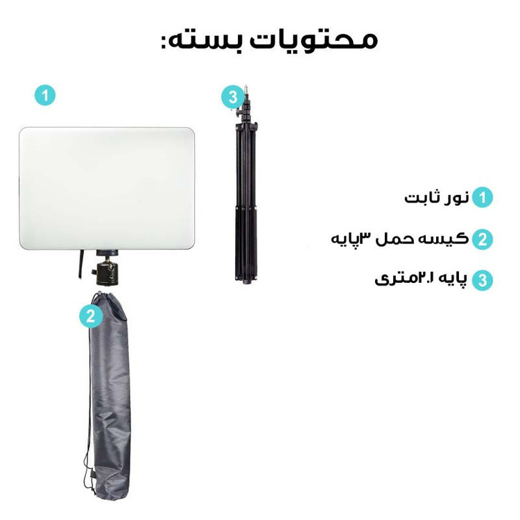 ویژگی ها: دمای رنگ قابل تنظیم از 2700 کلوین تا 6500 کلوین ،ابعاد 16در22 سانتی متر ،راه اندازی با یو اس بی ، دارای پایه فلزی 210 سانتی متری و کیسه حمل پایه ، قابلیت استفاده بصورت عمودی یا افقی ، ریموت سیمی