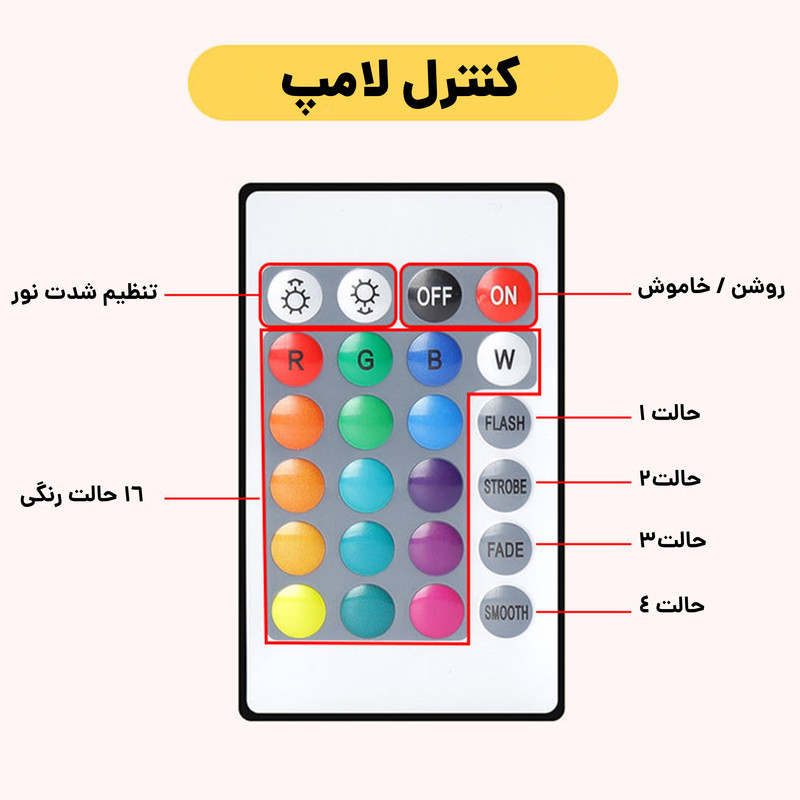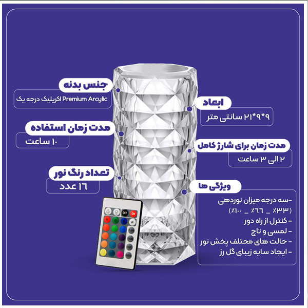 دارای ریموت کنترل ، دارای باطری داخلی قابل شارژ ، قابلیت لمسی