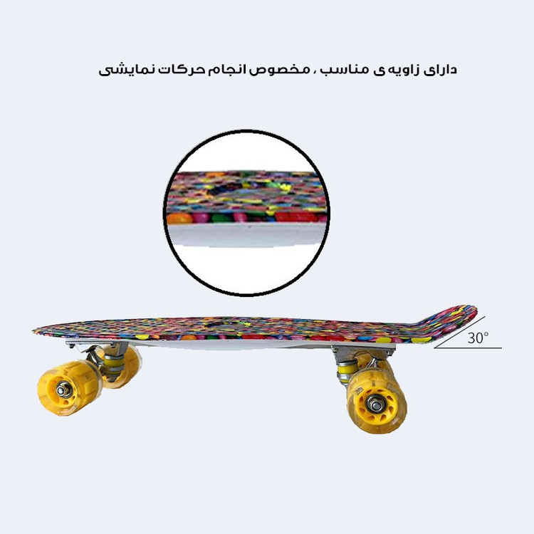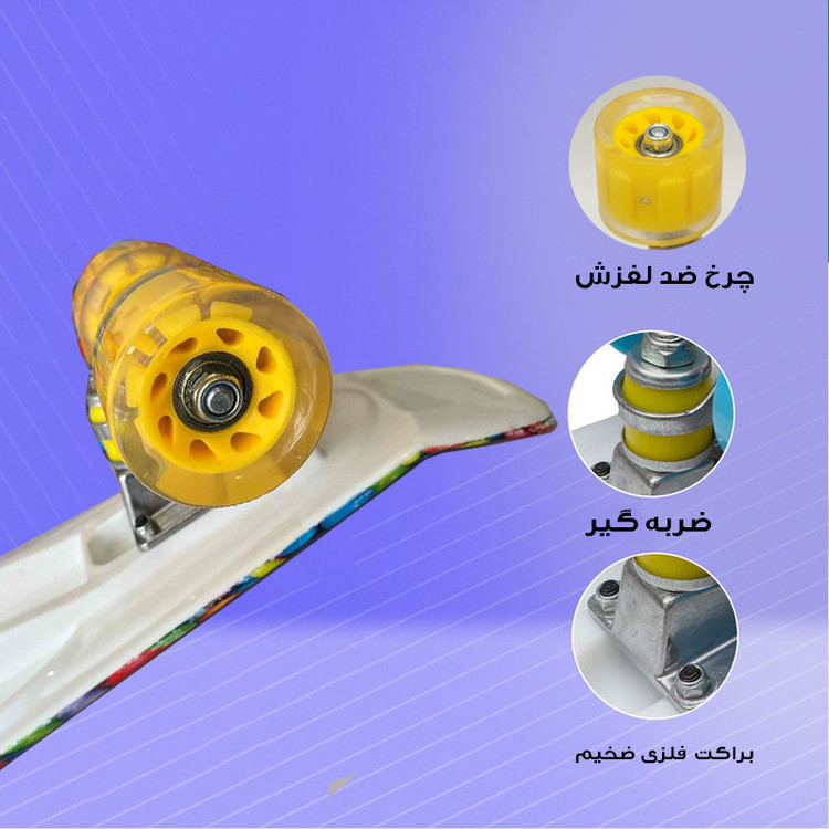 سبک و قابل حمل طراحی شیاردار و ضد لغزش ابعاد عرشه 56 در 15 سانتی متر جنس تیغه از پلاستیک فشرده و با کیفیت طراحی خاص برای تعادل و قدرت مانور بیشتر چرخ هابا پهنای 4 سانتی متر عرشه از جنس پلاستیک بادوام و مقاوم