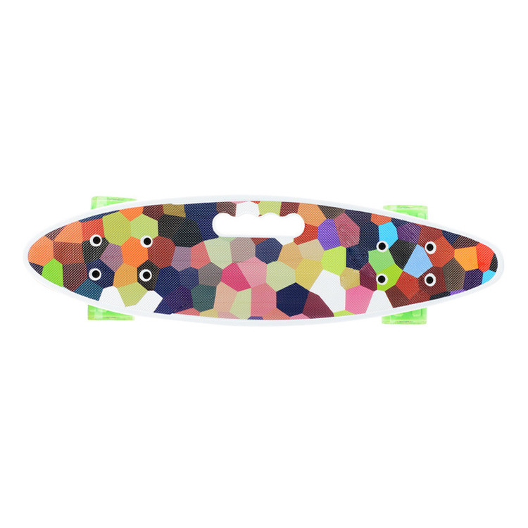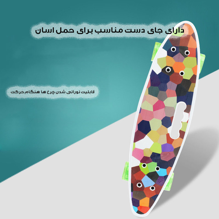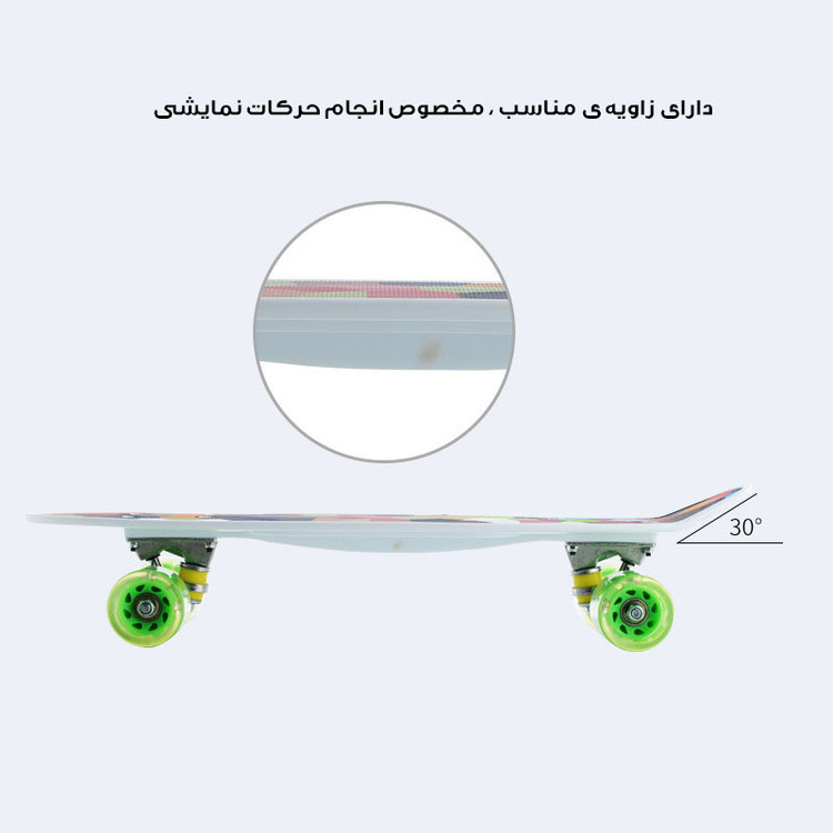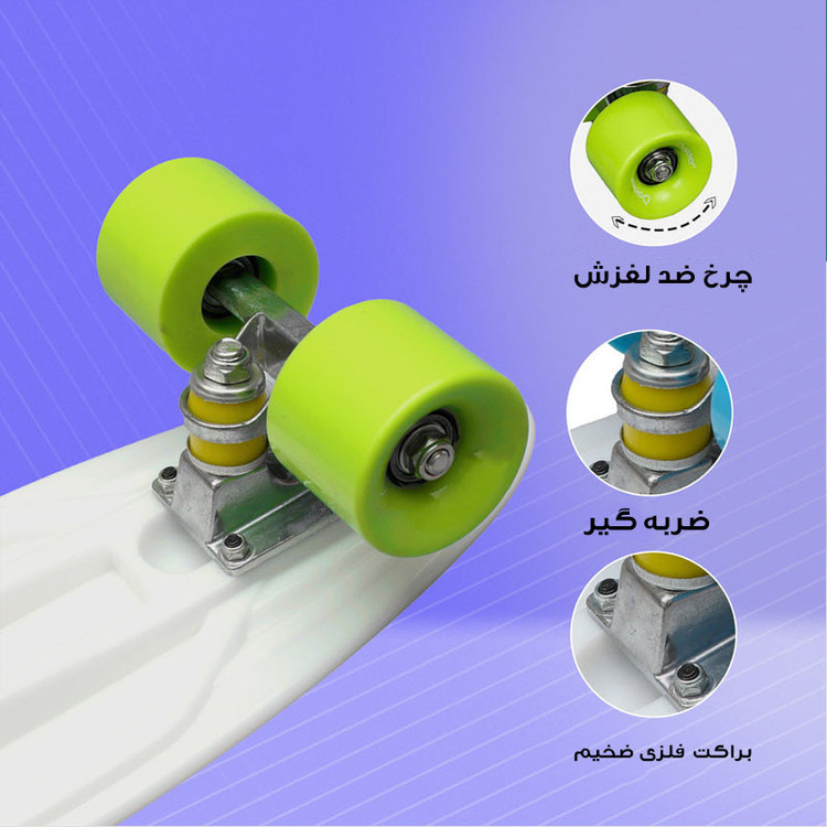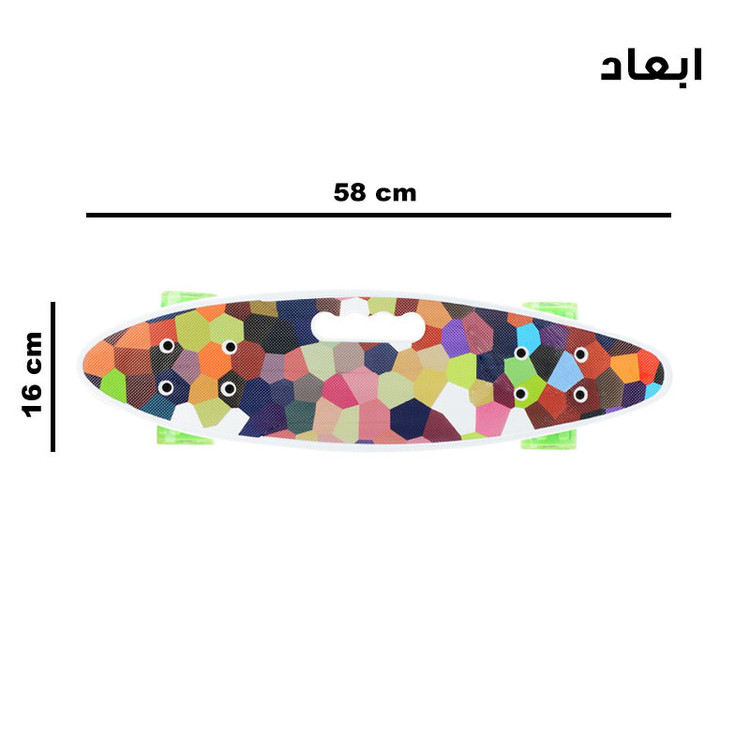 سبک و قابل حمل طراحی شیاردار و ضد لغزش ابعاد عرشه 15 x58 سانتی متر جنس تیغه از پلاستیک فشرده و با کیفیت طراحی خاص برای تعادل و قدرت مانور بیشتر چرخ هابا پهنای 4 سانتی متر عرشه از جنس پلاستیک بادوام و مقاوم