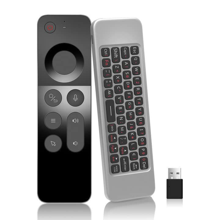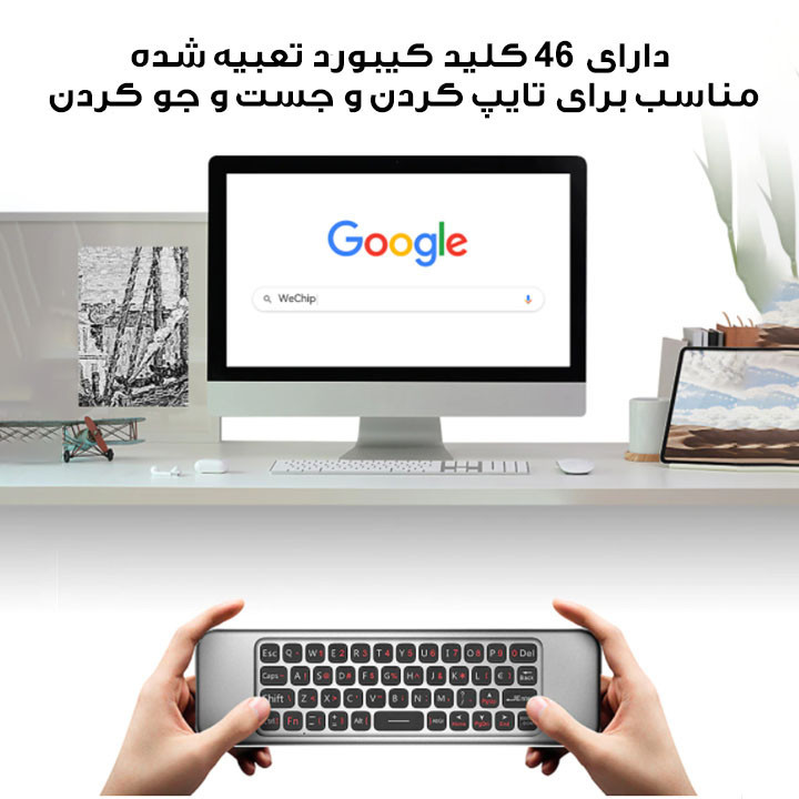 ریموت کنترل ایرموس اتصال توسط دانگل USB تامین برق توسط باتری داخلی با قابلیت شارژ دارای کیبورد و موس 6 جهته ژیروسکوپی دارای قابلیت Voice Control برد مفید 10متر