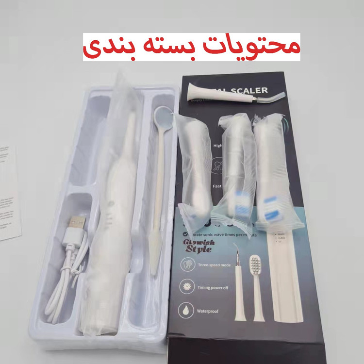 مسواک برقی . 3 عدد سری مسواک . 2 عدد سری جرم گیر . آینه . کابل شارژ .